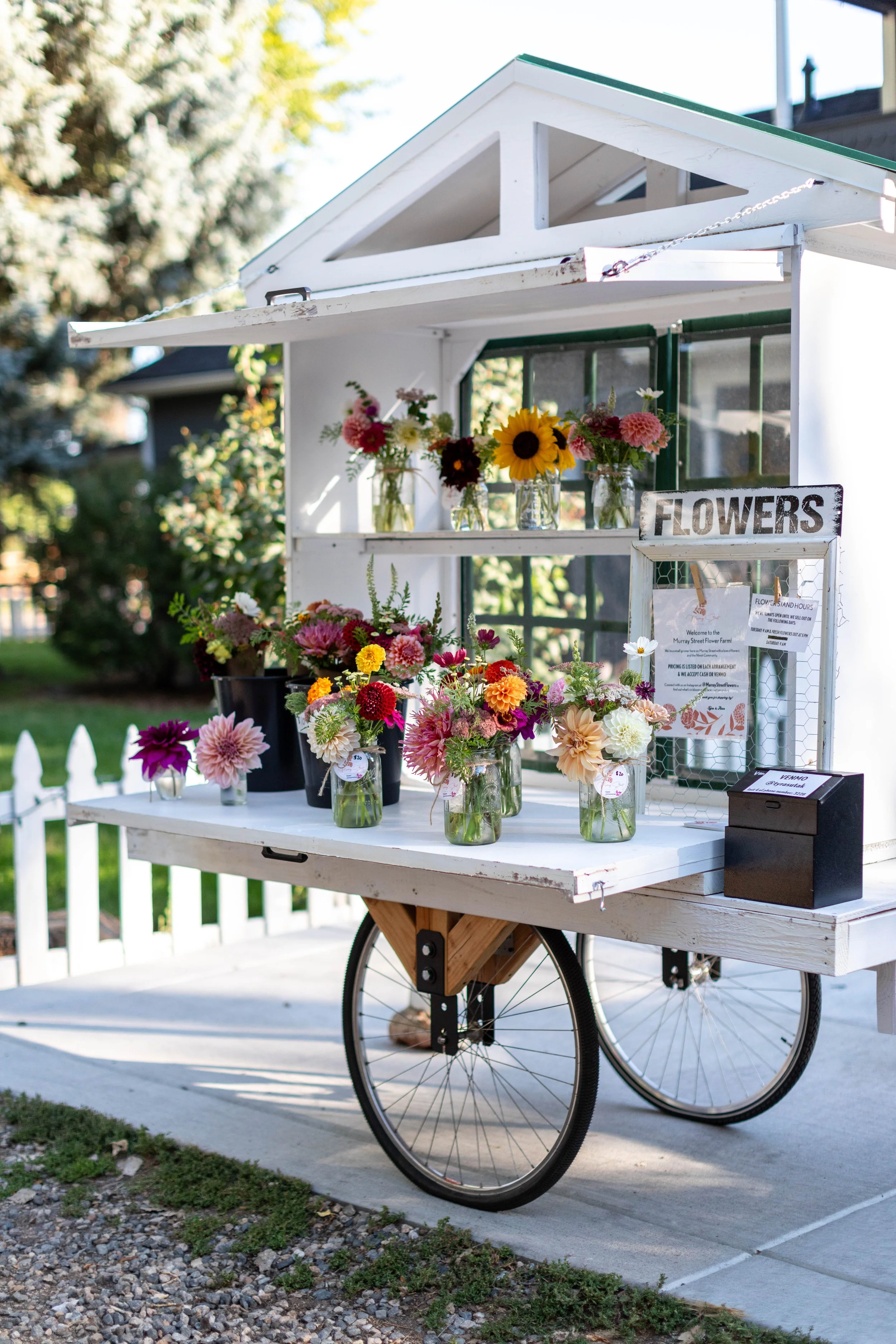 Fresh flowers from local Colorado growers have long been a staple on our dining room table, and in 2023, we decided to try growing flowers ourselves! We converted a portion of our backyard into dedicated growing space and grew a handful of our favorite flowers: dahlias, zinnias, sunflowers, strawflowers, celosia, cosmos, and more. We found an adorable old restored dresser at a local flea market and started selling arrangements out of our driveway.